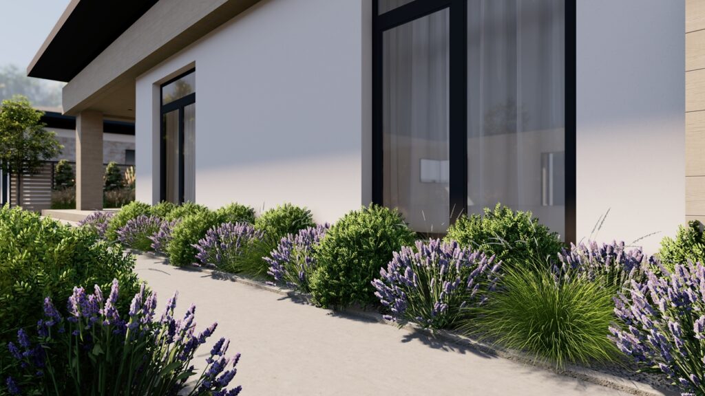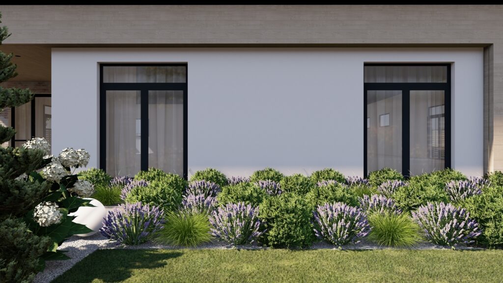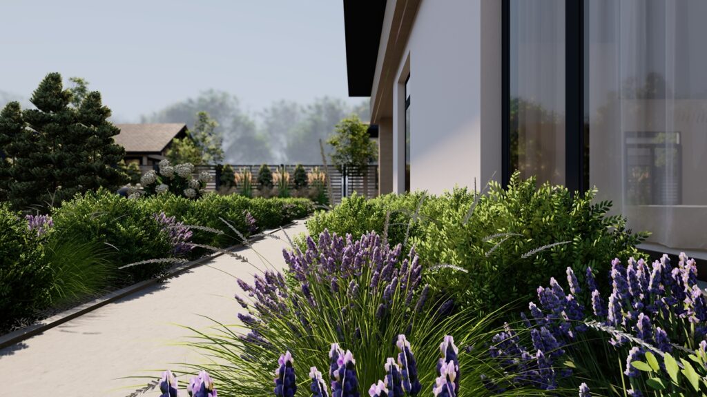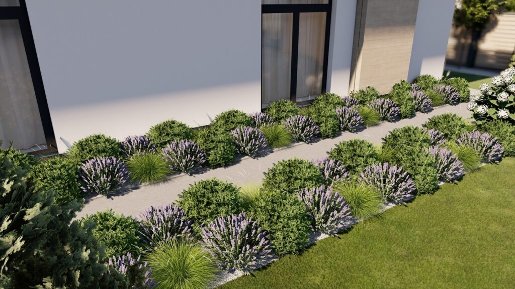 Kompozycja oparta na fioletowych i zielonych odcieniach tworzy stylową i harmonijną całość, która doskonale wita gości i dodaje charakteru elewacji. Rośliny dobrane do tej rabaty przy wejściu do domu są łatwe w pielęgnacji i odporne, dzięki czemu świetnie sprawdzą się w polskich warunkach, bez potrzeby ciągłej opieki.
